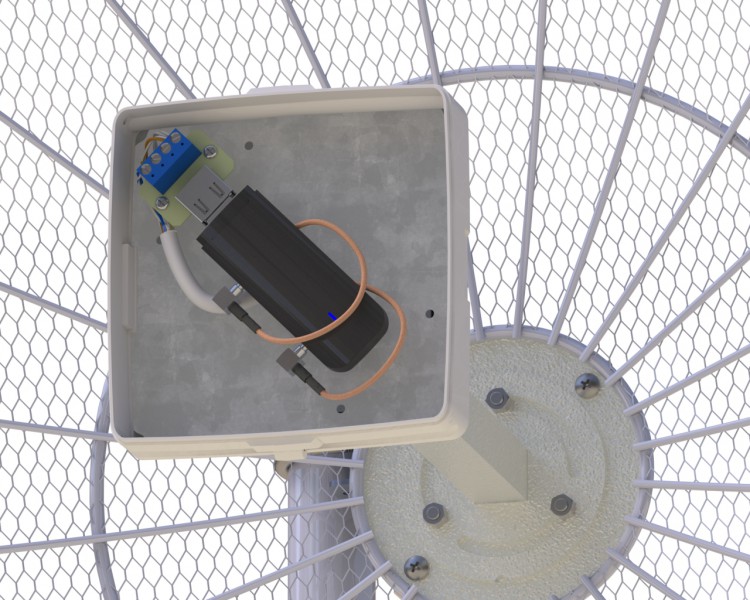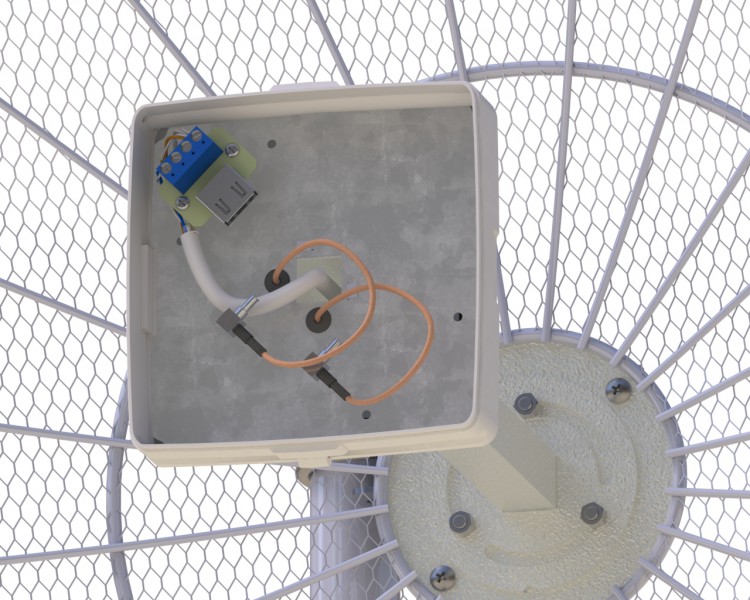 В конструкции облучателя антенны использованы решения хорошо зарекомендовавшие себя в популярном облучателе UMO-3 MIMO, благодаря чему, после установки облучателя в фокус зеркала, не требуется подстройка фокусного расстояния в зависимости от частоты работы оператора, так как фазовый центр облучателя практически един для всего рабочего диапазона частот антенны! Излучающие элементы укрыты в пластиковый корпус. Крепление облучателя позволяет изменять угол места, угол наклона поляризации, не снимая антенну с мачты! На месте! Не вращая зеркало!