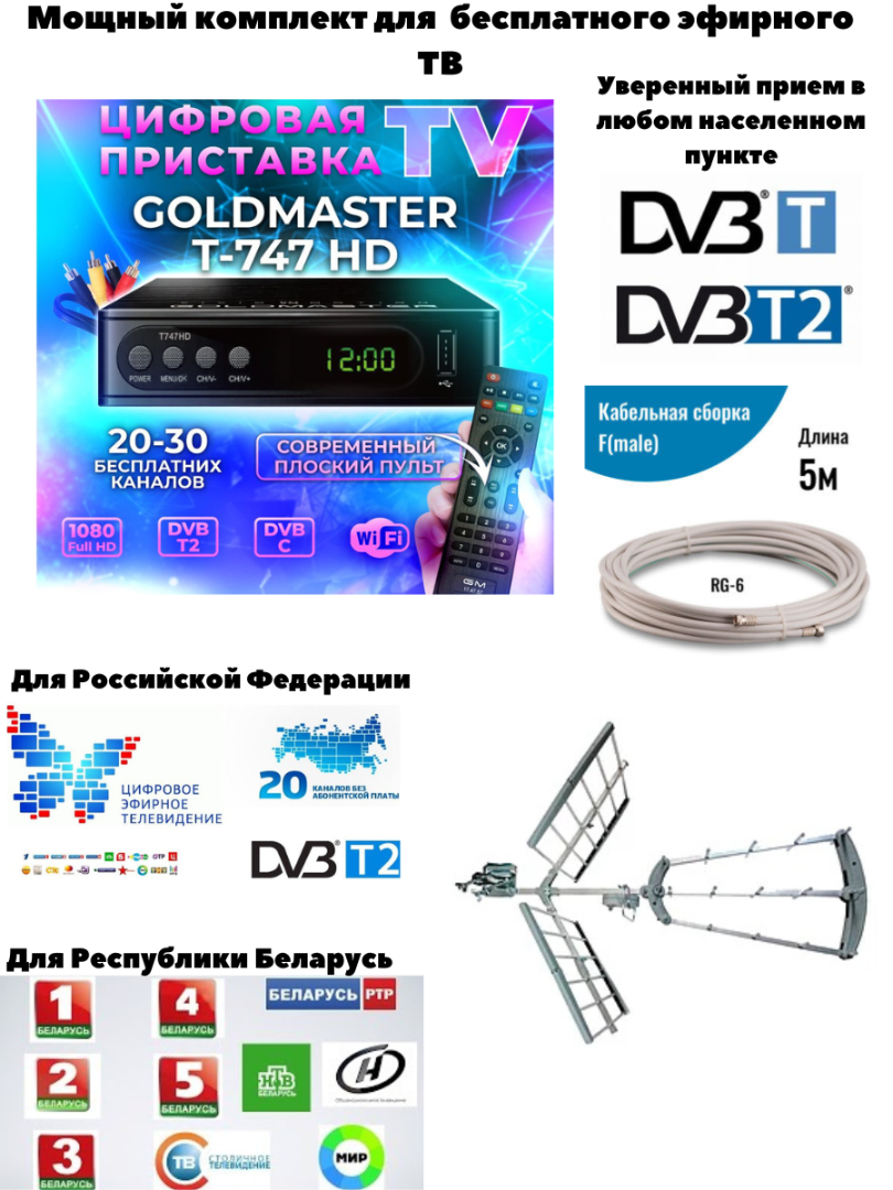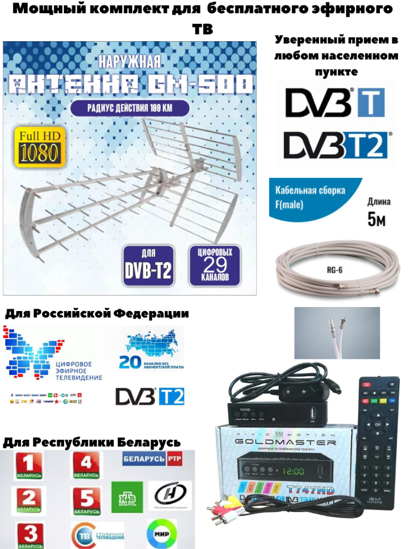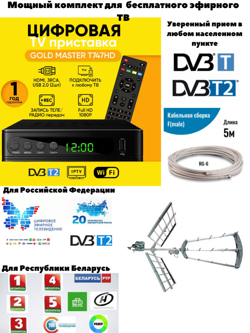Мощный комплект для бесплатного эфирного ТВ антенна + приёмник DVB-T2. Антенна, входящая в комплект, способна принимать хороший сигнал в большой дальности от вещательного центра. Эфирный приемник в комплекте обладает функцией медиаплеера и способен через USB воспроизводит большинство форматов, а также при подключении к сети интернет через usb-wi-fi переходник просматривать IPTV. Антенна уличная Goldmaster 500 для приема DVB T2 телевидения на расстоянии до 54 - 69 км от источника сигнала Пассивная уличная ТВ-антенна GoldMaster GM-500 предназначена для уверенного приема цифрового сигнала DVB-T/DVB-T2 в расчетном радиусе до 69 км. Реализована как вертикальная, так и горизонтальная поляризация. Антенна изготовлена из прочного алюминиевого сплава с защитой блока коннекторов от воздействия влаги. За счет полой конструкции элементов достигается малый вес – 2,5 кг в упакованном виде. Возможна установка на мачту, стену, крышу дома. Благодаря пассивному усилению в 22 дБ удается добиться качественного приема цифрового эфирного сигнала в значительном удалении от передатчика. Мощный комплект для бесплатного эфирного ТВ — идеальный выбор для тех, кто хочет получать до 9 цифровых каналов бесплатно в отличном качестве. В комплект входит приставка для цифрового ТВ GOLDMASTER T747HD, которая обеспечивает стабильный прием и четкое изображение. Поддерживает все основные форматы цифрового вещания и проста в установке. Также в комплекте идет дециметровая наружная антенна Gold Master GM-500, всеволновая и мощная уличная антенна, предназначенная для приема цифрового эфирного телевидения. Она обеспечивает уверенный сигнал на большом расстоянии, устойчива к погодным условиям и подходит для установки как в городе, так и в загородных домах. Кабельная сборка длиной 5 метров позволяет удобно настроить расположение антенны для наилучшего приема. Получайте до 9 бесплатных цифровых каналов без абонентской платы и наслаждайтесь любимыми программами!