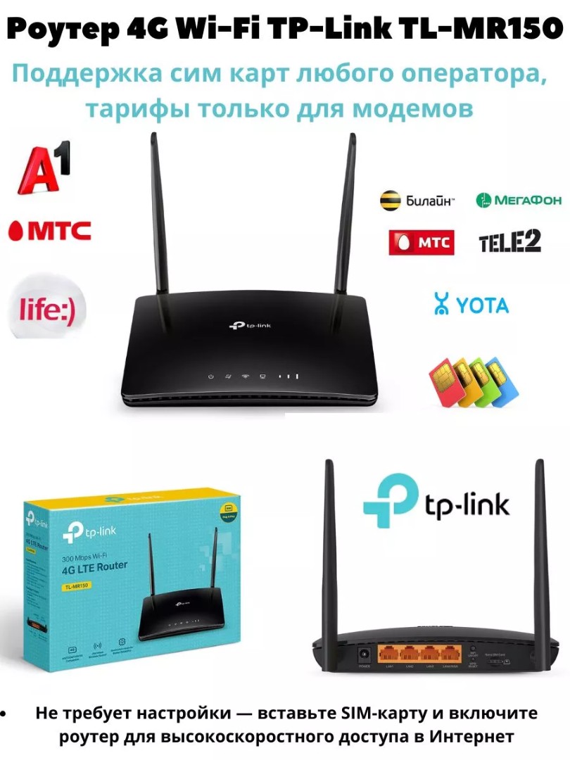4G Wi-Fi роутер TP-Link Archer MR150 со слотом для SIM-карты (до 100 Мбит/с, Wi-Fi 802.11n, 4 LAN-порта).