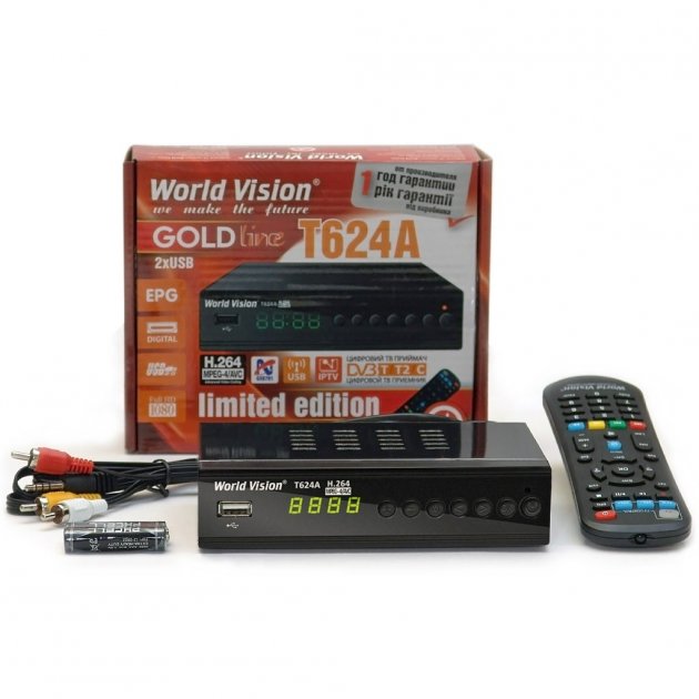 В телеприставке World Vision T624A установлен хорошо зарекомендовавший себя тюнер MaxLinear MXL608, обладает хорошей чувствительностью приёма DVB-T/T2 и DVB-C сигнала, в результате пользователь получает стабильность трансляции и качественное цифровое изображение на экран своего телевизора. Как и во всех новых моделях цифровых телеприставок World Vision, присутствует возможность подключения устройства к беспроводной сети через внешний USB Wi-Fi адаптер, поскольку не все модели адаптеров подходят для реализации такого вида соединения, то подробная информация указана в характеристиках на устройство.